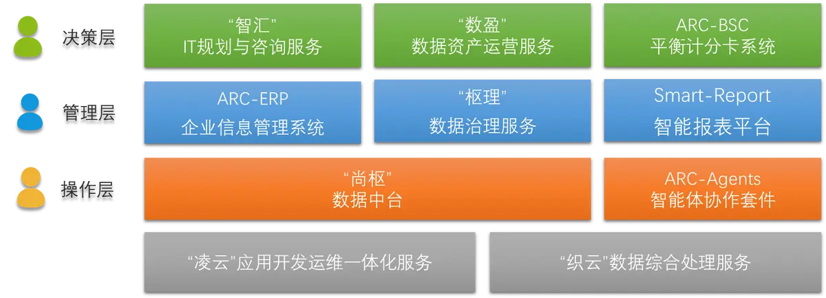 在決策層,“智匯”IT規(guī)劃與咨詢服務(wù),憑借專業(yè)團隊對行業(yè)趨勢和技術(shù)生態(tài)的深度洞察,為企業(yè)量身定制契合發(fā)展戰(zhàn)略的IT架構(gòu)藍圖,明晰數(shù)字化路徑;“數(shù)盈”數(shù)據(jù)資產(chǎn)運營服務(wù),挖掘企業(yè)數(shù)據(jù)價值,將分散數(shù)據(jù)轉(zhuǎn)化為可運營、能創(chuàng)造效益的資產(chǎn),驅(qū)動業(yè)務(wù)創(chuàng)新;ARC - BSC平衡計分卡系統(tǒng),以戰(zhàn)略為導(dǎo)向,從財務(wù)、客戶、內(nèi)部流程、學(xué)習(xí)與成長等維度,量化指標、監(jiān)控進度,助力科學(xué)決策 。