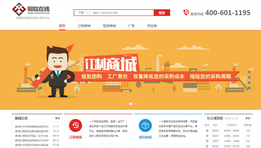 銅鋁在線(xiàn)為有色金屬行業(yè)的電子商務(wù)交易平臺(tái),采用系統(tǒng)自動(dòng)組批團(tuán)購(gòu)的方式,將需求相同的客戶(hù)組批給統(tǒng)一廠家競(jìng)價(jià),以組團(tuán)形式在降低買(mǎi)家采購(gòu)成本的同時(shí)降低工廠的生產(chǎn)成本。平臺(tái)同時(shí)提供現(xiàn)貨采購(gòu)模式,供用戶(hù)實(shí)現(xiàn)快速線(xiàn)上交易。