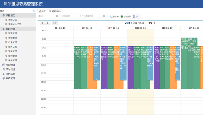 - 基礎設置: 管理排課相關的基礎數據,包括教室、班級、學生、老師等
