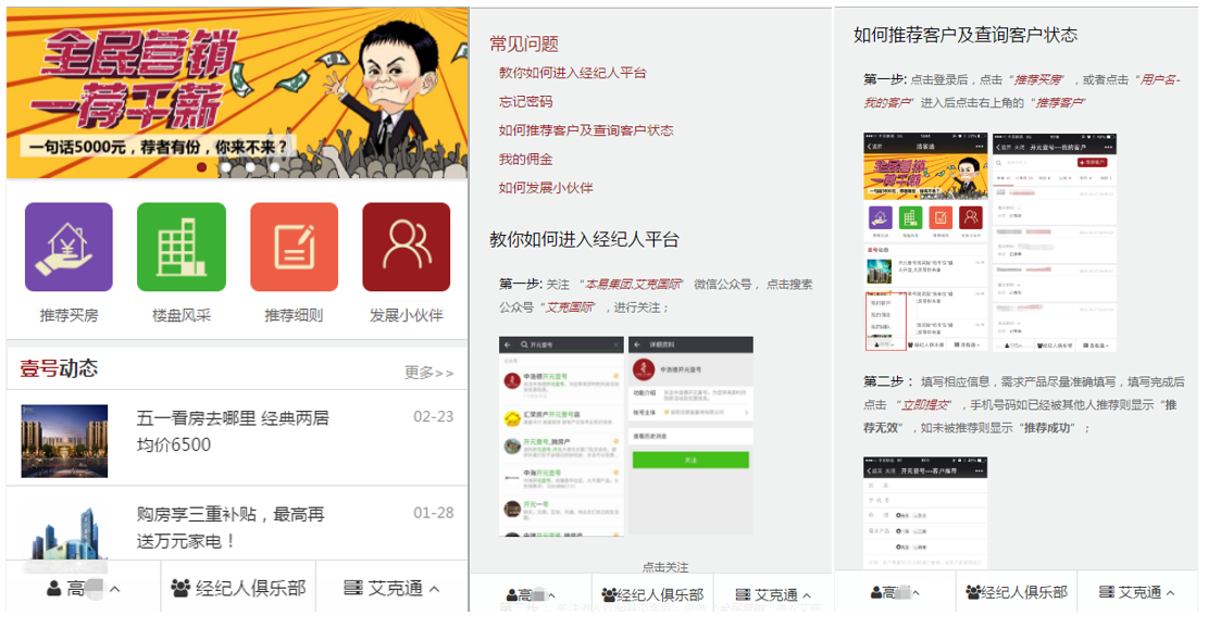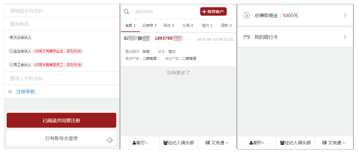 客戶注冊:擁有微信并關(guān)注公眾號(hào),即可注冊申請成為全民營銷系統(tǒng)的用戶(全民經(jīng)紀(jì)人)。注冊用戶可隨時(shí)通過微信查看已經(jīng)推薦的客戶信息、購房進(jìn)度、傭金結(jié)算情況。